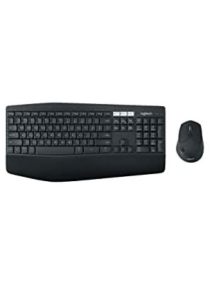 | Logitech MK850 Performance - Wireless Keyboard and Mouse ComboComfortable keyboard and mouse with advanced multi-device functionalities.Experience next-level comfort and productivity with the powerful Logitech MK850 Performance Wireless Keyboard and Mouse Combo. Fly through documents and web pages with hyper-fast scrolling ± and type quietly and efficiently on a full-size keyboard with carefully crafted keys. The cushioned palm rest and curved keyframe give you the support you need, while adjustable tilt legs offer the perfect typing angle and the contoured design of the mouse fits comfortably in your palm.